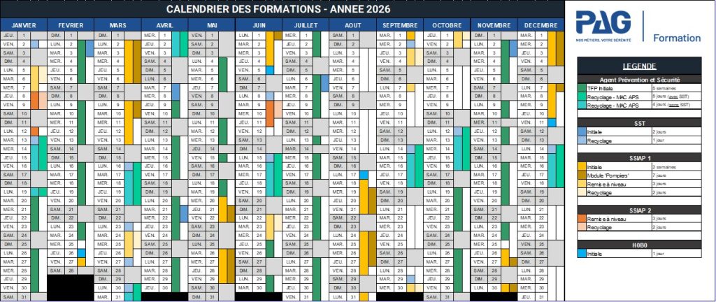 Pour 2026, l’équipe PAG Formation a prévu un programme qui permet de former de nouveaux agents de sécurité avec la possibilité d’enchaîner le TFP APS (Titre à Finalité Professionnelle Agent de Prévention et Sécurité) et la formation initiale SSIAP 1 (Agent des Services de Sécurité Incendie et Assistance à Personnes). Les nouveaux agents formés pourront ainsi évoluer aussi bien en sûreté qu’en sécurité incendie. La formation SST (Sauveteur Secouriste du Travail) est incluse dans le programme du TFP APS ; toutefois si vous souhaitez obtenir uniquement cette compétence en secourisme nous proposons 5 sessions initiales de SST.